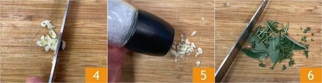 In the meantime, prepare the flavored oil: finely chop a clove of garlic 4, then add a pinch of salt 5 and crush it with the knife blade to obtain a sort of paste. Finely chop the aromatic herbs as well, keeping one sprig of rosemary aside 6.