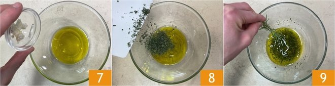 Pour the oil into a bowl, then add the garlic 7 and herbs 8 and stir with the rosemary sprig, which will be used to brush the meat 9.