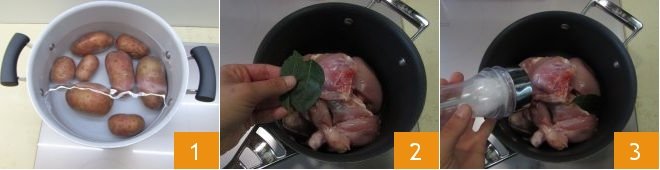 To make the potato pie, boil the potatoes 1 for about 35-40 minutes or until they are soft. Meanwhile, place the chicken in a saucepan with the bay leaf 2 and salt 3