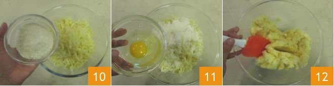 Season the puree with Parmesan 10, salt, pepper, then add the egg 11 and mix everything well 12.