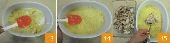 Oil the bottom of a baking dish measuring about 12x8 inches and line it with about four heaping tablespoons of mashed potatoes 13, pressing the bottom well to make it even 14. Add the seasoned chicken 15