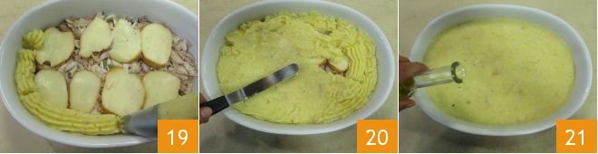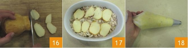 Slice the scamorza cheese thinly 16 and distribute a layer over the chicken 17. Transfer the remaining potato puree into a piping bag 18