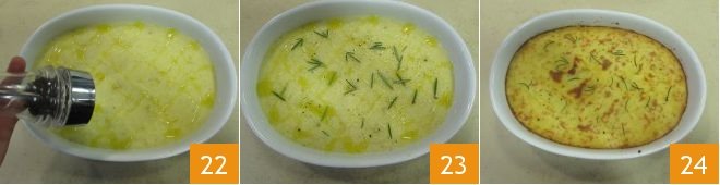 and distribute it evenly 19, smoothing the surface with a spatula 20. Finally, season with a drizzle of oil 21;