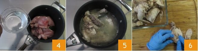 and a quart of water 4, cook for 30 minutes. Once the chicken is ready 5 let it cool and then use your hands to debone and shred the meat 6.