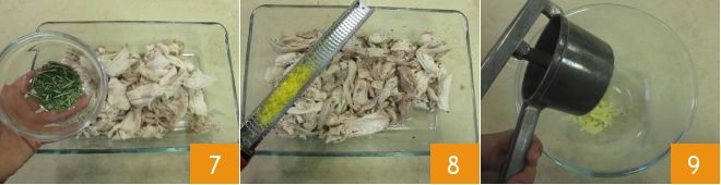 Place the chicken in a bowl and season with chopped rosemary 7, salt, pepper, and grated lemon zest 8. Set aside, then take the cooked and still warm potatoes and pass them through a potato ricer, collecting the puree in a bowl 9.