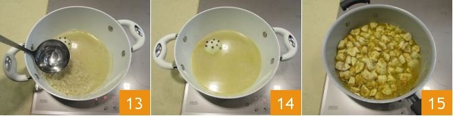Add a ladle of hot water 10 and let it cook for about 10 minutes. In the meantime, start cooking the basmati rice. Insert the cloves into the sides of a half onion 11, this way they won't scatter during cooking and will be easy to remove. Place the onion in a pan with the oil. Let it sauté for a couple of minutes, then add the basmati rice 12.