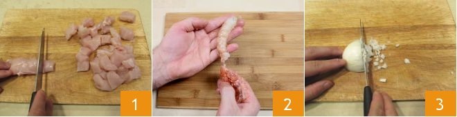To prepare the chicken and shrimp curry with basmati rice, take the chicken breast and cut it into cubes, about 1 inch 1. Shell the shrimp tails 2, if you prefer, you can also remove the intestine with a toothpick, pulling it out from the back. Store the shrimp tails in the refrigerator until ready to use. Next, peel the onion and finely chop it 3;