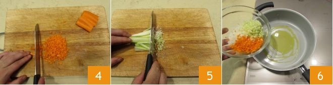peel the carrot, chop it as well 4, and finally chop the celery, removing the outer strings 5. Pour the oil into a pan along with the chopped mix for the sauté (onion, carrot, and celery) 6.