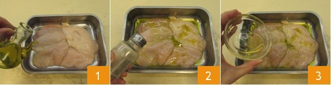 To prepare the chicken and zucchini salad, first, take care of marinating the chicken: place the chicken breasts in a baking dish, pour in the oil 1, season with salt and pepper 2, then add the honey 3,