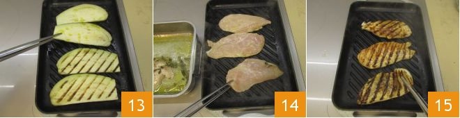 Grill and salt the eggplants as well, turning them on both sides 13, then move on to the chicken, which you will take directly from the marinade to transfer it to the grill 14. Use kitchen tongs to turn the slices to the other side so as not to pierce the meat and avoid the juices from leaking out 15.