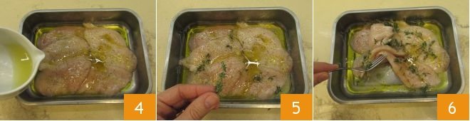 the juice of half a lemon 4, and a few sprigs of thyme 5. Turn the slices on both sides so that the entire surface of the meat is in contact with the marinade 6, then cover the baking dish with plastic wrap and let it rest for an hour at room temperature.
