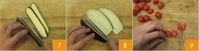 In the meantime, prepare the vegetables: wash the zucchinis, trim the ends, and slice them lengthwise with a knife into slices about 0.4 inches 7. Do the same with the eggplants 8. Finally, wash and quarter the cherry tomatoes 9.