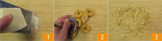 To prepare the chicken bombs with cheese and pepper, start by grating the Pecorino 1. Now coarsely crush the taralli with a meat tenderizer 2 to break them into crumbs and set them aside 3.