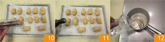 Place them on a baking sheet lined with parchment paper, sprinkle with pepper 10 and drizzle with oil 11. Bake in a preheated ventilated oven at 392°F for about 20 minutes, turning the bombs halfway through cooking. While the bombs are in the oven, prepare the sauce: in a small saucepan, toast some pre-ground black pepper for a few minutes, once toasted, pour in the water and turn off the heat 12.