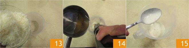 Pour the grated Pecorino into a jug 13 and add the now lukewarm water 14, blend with an immersion mixer to obtain a smooth sauce 15.