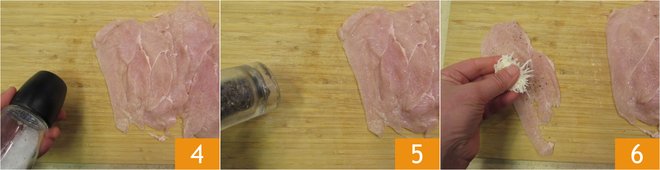 Take a slice of chicken, season with salt 4 and pepper on both sides 5. Stuff the center with about 0.18 oz of Pecorino and a sprinkle of oregano 6.