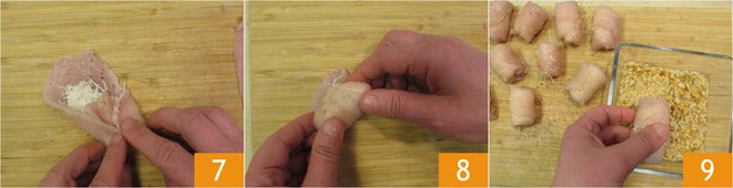 Fold the sides inward 7 and wrap the slice to create the roll 8. With these quantities, you will make 12. Roll the rolls in the crumbled taralli 9.