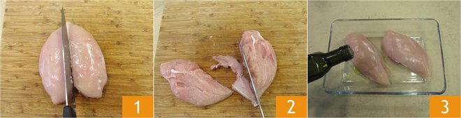 To prepare the chicken breast with peppers and olives, first cut the chicken breast into two parts 1 and remove the bone and any fatty and stringy parts 2. Place the two pieces on a baking dish and season both sides with salt, oil 3, and black pepper.