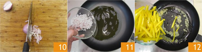 Finely chop the shallot 10. Now, take a large pan, pour a drizzle of oil, and add the shallot 11. Sauté for about 5 minutes over low heat. Add the peppers (yellow and red, or only yellow by doubling the amount), and cook for about 10 minutes 12.