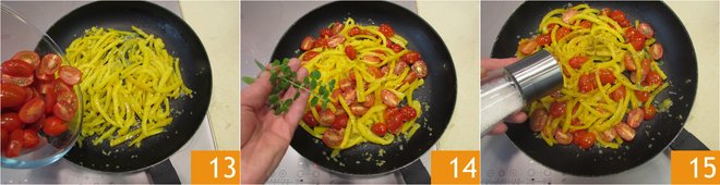 Add the cherry tomatoes 13. Salt and pepper, season with marjoram leaves 14, and let cook over low heat for about 10-15 minutes. At the end of cooking, adjust the salt if necessary 15.