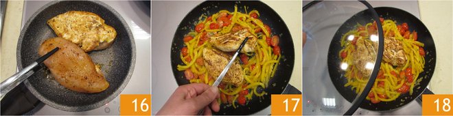Take another non-stick pan. Pour a drizzle of oil and heat well. Brown the chicken breasts on both sides 16. Transfer them into the pan with the peppers and tomatoes, cover with a lid 17, and cook for about 15-20 minutes, checking the cooking and turning the chicken 4-5 times. The lid helps prevent the chicken breast from drying out; if it does, add a little water.