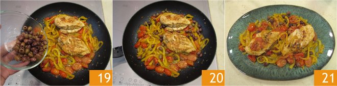 At the end of cooking, also add the olives 19, and the chicken breast with peppers and olives is ready to be served 21.
