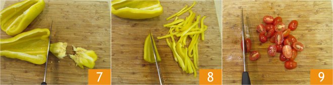 Wash the vegetables, cut the peppers in half, remove the filaments and seeds inside 7, and cut them into strips 8. Cut the cherry tomatoes in half 9.