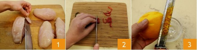 To prepare the chicken in soy sauce with steamed vegetables, start with the meat: from the whole chicken breast remove the central bone and the fattier parts, then cut into slices 1; then remove the seeds from the chili pepper and cut it into strips 2, then grate the orange 3 and lemon zest;