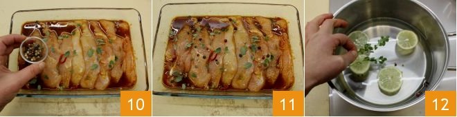 Sprinkle with peppercorns 10 make sure all the fillets are covered in the marinade 11 then cover with plastic wrap and place in the refrigerator for at least 2 hours to season. Meanwhile, in a steamer, pour the water, add the lemon sliced, peppercorns, and marjoram 12 and bring to a boil.