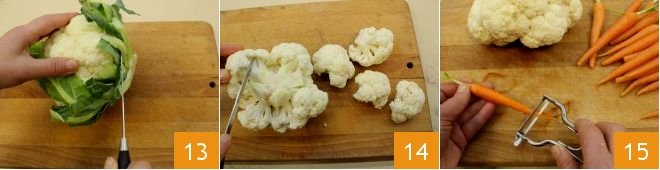 In the meantime, prepare the vegetables to cook in steam: remove the trunk and outer leaves of the cauliflower 13 and separate the florets from the main trunk 14; rinse them under running water, then peel the baby carrots with a vegetable peeler leaving the green tuft intact; then trim the ends of the snow peas and rinse them under running water too.