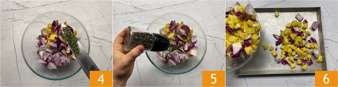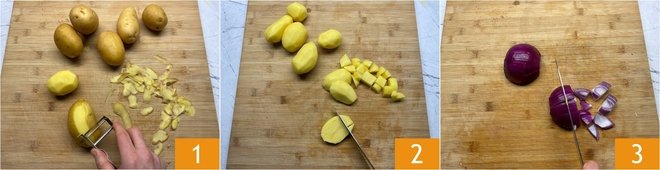 To prepare the chicken roll, start with the side: peel the potatoes 1 and cut them into 3/5 inch chunks 2. Do the same with the red onion 3.