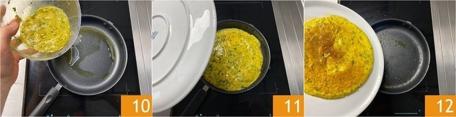 Pour the mixture into a well-heated non-stick pan of about 8-9 inches 10 and cook for 3-4 minutes over medium heat. When the surface becomes a bit more compact, cover the pan with a large plate 11 and flip the omelet. Continue cooking on the other side for 1-2 minutes 12.