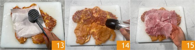 While allowing the omelet to cool, deal with the deboned chicken: place it on a cutting board with the skin side down and carefully pound it with a meat mallet, using parchment paper to avoid tearing the meat 13. Once the chicken is thin, season it with salt and pepper 14. Stuff it first with slices of ham 15.