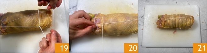 Wrap the string around your hand twice to form a small loop and pass it around the meat 19, reaching the point where you secured the roll 20. Repeat this step, spacing the string loops a couple of inches apart until the roast is completely encased. Once you reach the other end, close with another knot 21.