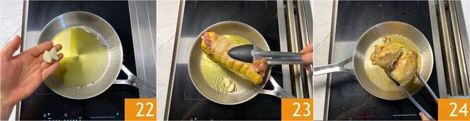 Move on to cooking the roll: in a steel pan, heat the oil with garlic cloves 22 and brown the roll on the skin side 23. Let the meat seal for 1-2 minutes over high heat, trying not to move it. Only when the side in contact changes color can you turn it without effort, allowing all sides to brown 24.
