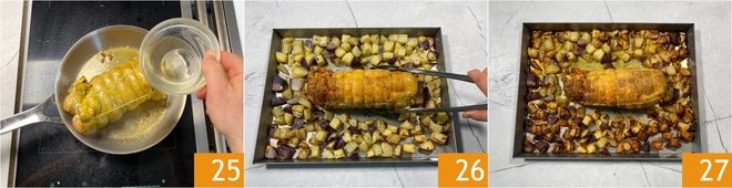 Deglaze with white wine 25 and let it completely evaporate. Keep the cooking juices in the pan and take out the baking dish with the potatoes. Place the stuffed chicken roll in the center 26 and continue cooking in the oven for another 20-25 minutes. Remove from the oven and let rest for 5 minutes 27 before slicing your chicken roll and serving it, topping with the reserved cooking juices!