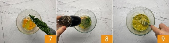 In the meantime, focus on the omelet: break the eggs into a bowl, add chopped parsley 7, salt, and pepper 8 and beat well 9.