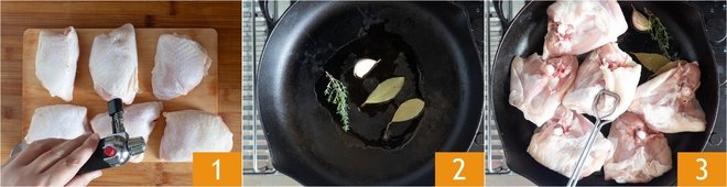 To prepare the chicken thighs in a pan, first remove any feathers by burning them with a torch 1; alternatively, you can pluck them or pass the thighs near the stove flame. In a large pan, heat a swirl of oil with the unpeeled garlic, thyme, and bay leaf 2. Let it infuse, taking care not to burn the garlic; when it's very hot, add the chicken with the skin side down 3.