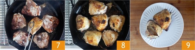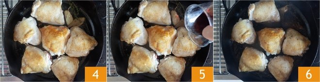 Let it brown for about 5 minutes over high heat, then turn the thighs 4 and deglaze with wine 5. Cook over low heat for about 20 minutes 6, adding a little water if necessary.