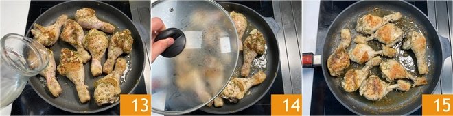 Deglaze with the white wine 13 and let it evaporate completely, then add the water, cover with the lid 14, and cook for 30 minutes, still over low heat. After this time, remove the lid and continue cooking for another 10 minutes 15. Your pan-fried chicken thighs are ready to be served!