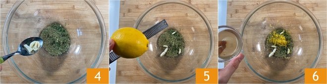 To prepare the pan-fried chicken thighs, first mix the rosemary 1, parsley 2, and dried oregano 3 in a large bowl.