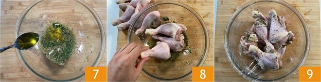Finally, pour the oil 7 and place the chicken thighs in the bowl 8. Massage the meat well to season it evenly, then cover with plastic wrap 9. Place the bowl in the refrigerator for at least 3 hours, turning the thighs halfway through the marinating time.