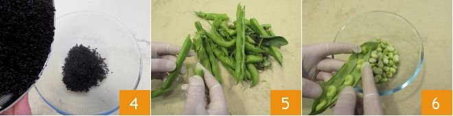 Once cooked, drain it and let it cool by pouring it into a bowl 4. While the rice is cooking, you can prepare the vegetables: start with the fava beans: remove the central filament, then trim one end and open the pod to shell it (5-6): for this operation, you can wear food-safe gloves to avoid staining your hands. Once finished, set them aside!