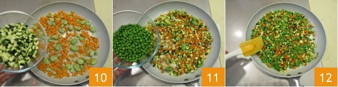 Next, add the zucchini, sauté for another 3-4 minutes and finally add the peas 11. Continue to sauté, slightly lowering the heat and stirring occasionally 12; continue cooking until the peas are cooked.