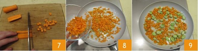 Continue shelling the peas; then peel and trim the carrots, then cut them into sticks and then into cubes about 1/4 inch thick 7. Wash and trim the zucchini and cut them also into cubes about 1/4 inch. Then proceed with cooking: pour a drizzle of oil into a large pan, heat it, and add the carrots first 8; cook them for 3-4 minutes over high heat, stirring occasionally, then add the fava beans 9 and cook for another 3-4 minutes.