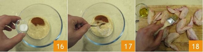 the sweet paprika and salt 16. Mix everything well 17 and place the seasoned coating in a shallow, wide bowl. Then carefully brush the clean chicken wings with oil 18.