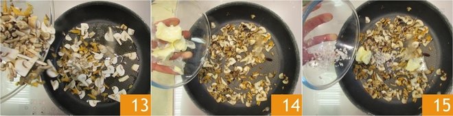 Pour the mushrooms into a pan with a drizzle of hot oil 13 and sauté over high heat for 5-8 minutes. Add the butter 14 and chopped shallots 15 and brown.