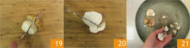 Set aside the sauce and take the mushrooms you had set aside: if they are small, leave them whole; if they are porcini, cut them in half 19 and make crosshatch cuts on the cut side of the stem 20. Place the mushrooms in a pan with a drizzle of hot oil 21.