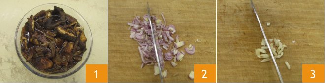 To prepare the chicken, start by soaking the dried mushrooms in warm water for about 20 minutes 1. Clean and finely chop the shallot 2 and the garlic 3.