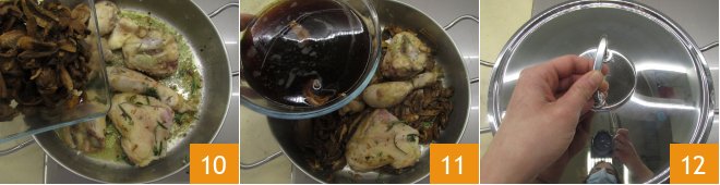 also brown the chicken thighs on both sides 7. Deglaze with white wine 8 and let the alcohol evaporate: it will only take a few moments. Add the seasonings 9,